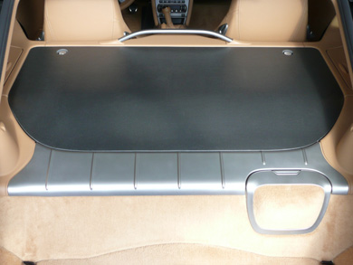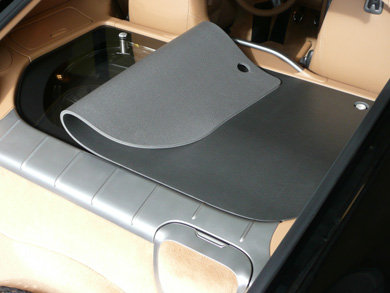 TO DISPLAY THE ENGINE, SIMPLY REMOVE THE FORWARD CARGO-NET ATTACHMENT FITTINGS BY PULLING UPWARD ON THE D-RINGS AND ROLL-UP ( DO NOT FOLD OR CREASE) THE PROTECTIVE COVER WITH THE BLACK VINYL FACING OUTWARD. THE PROTECTIVE COVER CAN BE STOWED TEMPORARILY IN THE AFT TRUNK SPACE. |