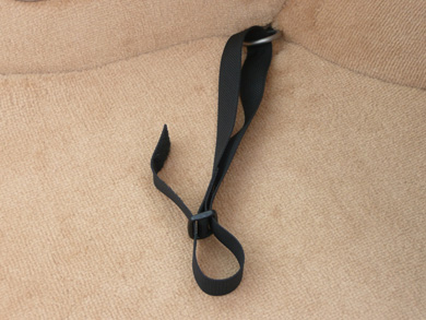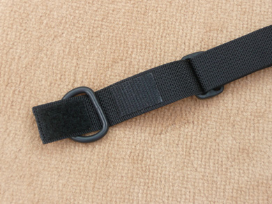 NOW INSTALL THE D-RING BY INSERTING THE STRAP THROUGH THE D-RING AND FOLDING THE STRAP BACK-OVER THE D-RING TO SECURE THE HOOK & LOOP ATTACHMENT. |